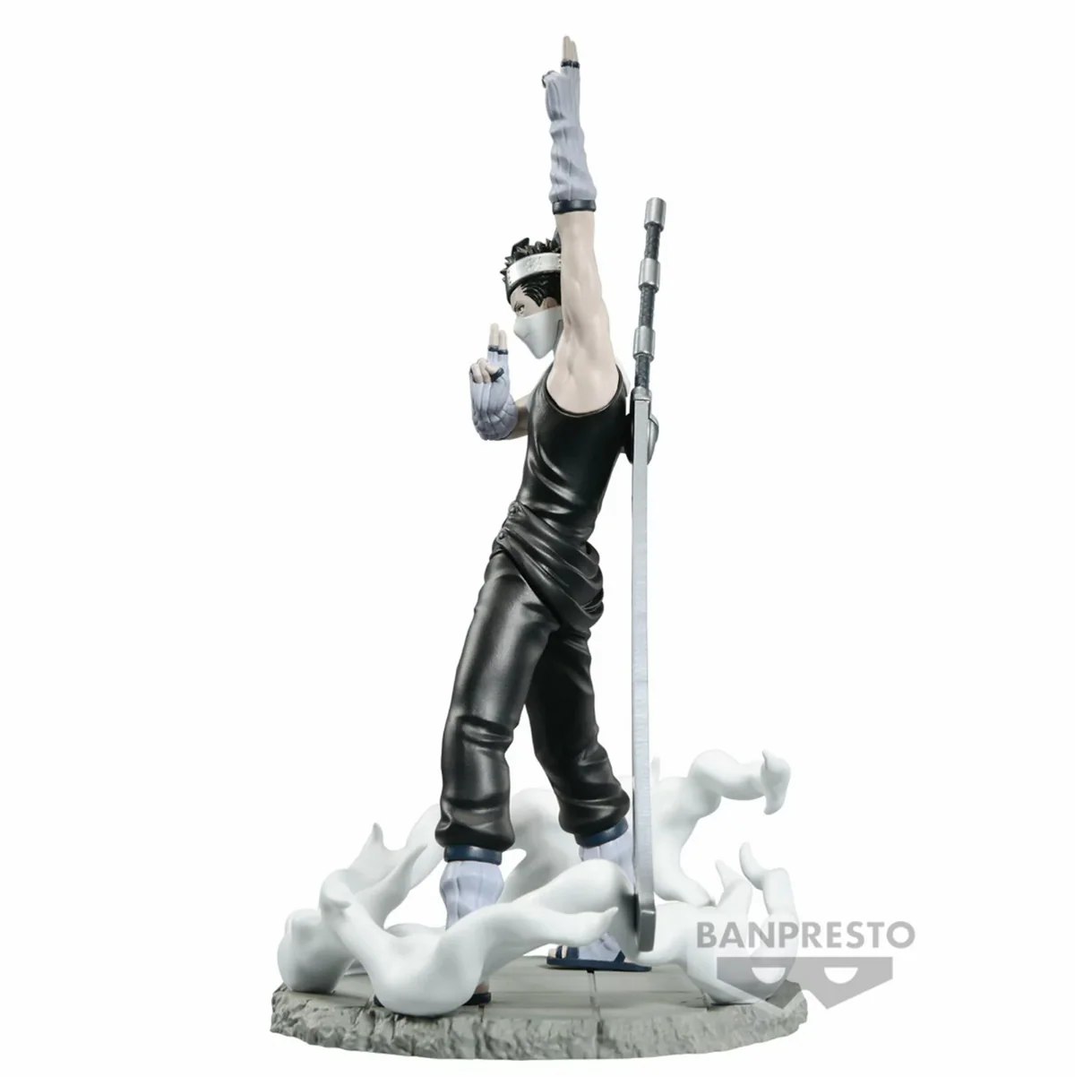 Cloud effects rise around his feet to suggest mist on the battlefield. Simple black clothing, wrapped arms, and the long blade are all captured with clear lines. Fans who enjoy naruto figures will notice the focused eyes and calm but dangerous stance in this naruto shippuden action figure.