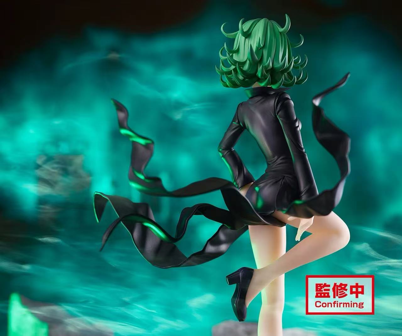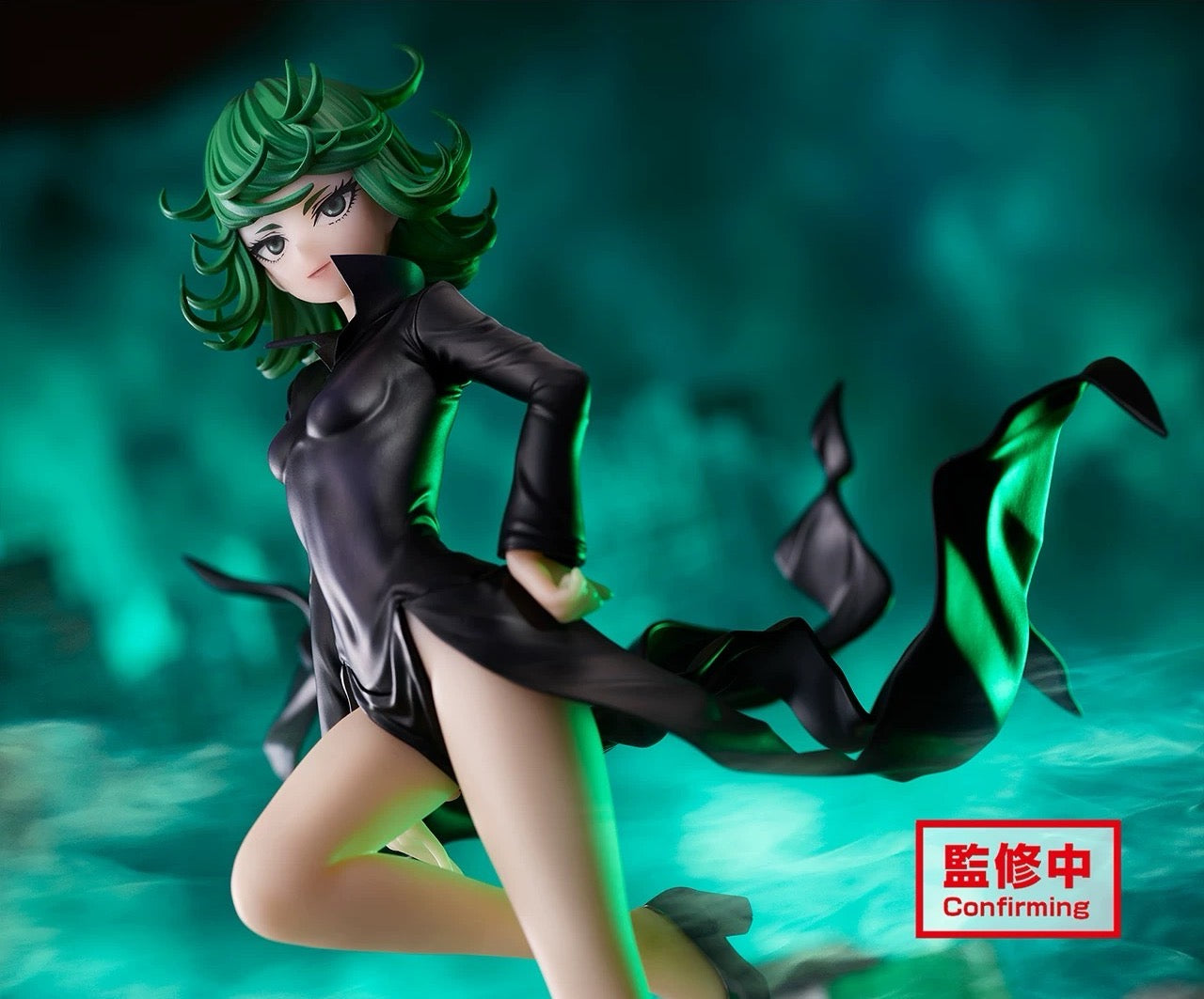 Deze dynamische one-punch man-figuur toont Tatsumaki in een scherpe, door de wind geteisterde pose. De wapperende jas en zelfverzekerde houding geven je plank direct energie.